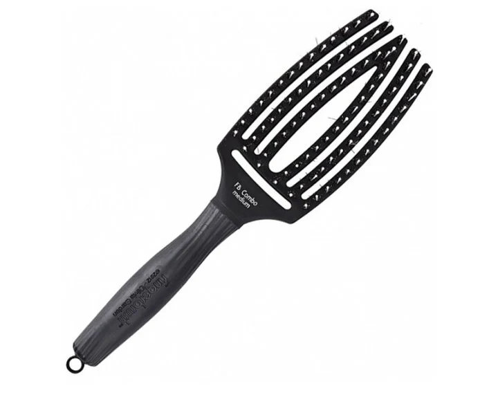 Olivia Garden FingerBrush Combo Medium heeft antistatische en geïoniseerde nylon haren en everzwijnharen. Het everzwijnhaar strijkt het haar glad en geeft glans en volume. De nylon haren stimuleren de hoofdhuid zacht. De borstel is zeer flexibel en heeft de vorm van een hand, zodat de hoofdhuid gemasseerd wordt. De borstel kan gebruikt worden op zowel nat als droog haar.
